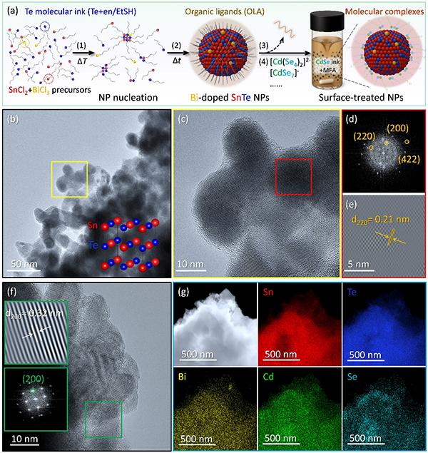 1)低成本规模化合成:以胺/硫醇复配替代昂贵TOP,制备高活性Te前驱体,SnTe纳米颗粒产率超90%,突破成本高、产率低瓶颈。
