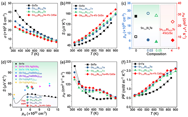 图3的DFT计算揭示Bi掺杂与CdSe处理对SnTe能带的协同调控,提升态密度与价带简并度,为增强塞贝克系数与优化电子输运提供理论依据(图4-5)。