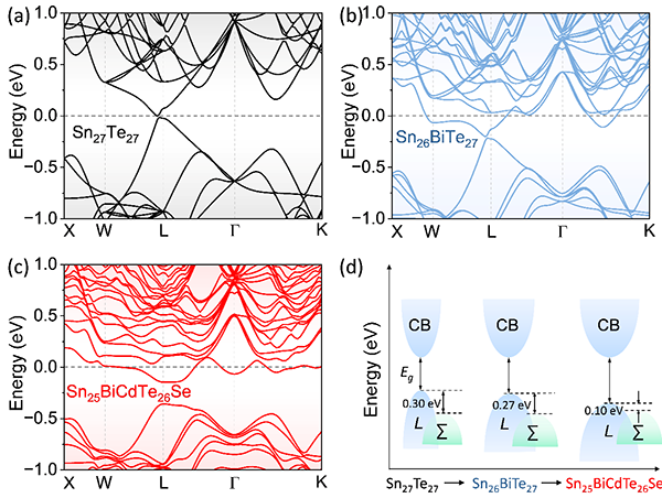 2)电子能带协同优化:Bi掺杂与CdSe表面处理协同作用,将价带极大值差由0.30 eV降至0.10 eV,提升价带简并度与塞贝克系数。