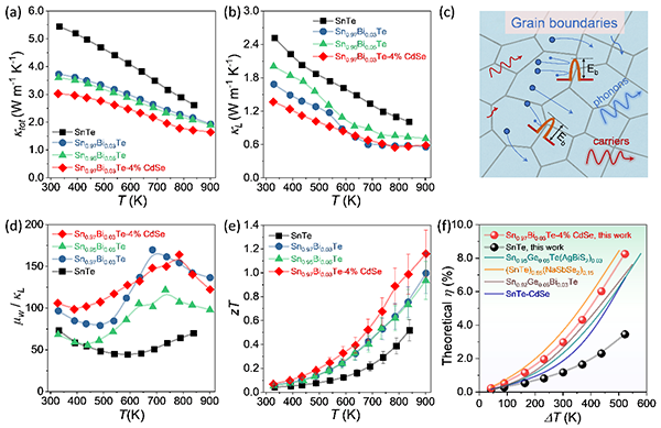 综上所述,Lim Khak Ho/刘玉/洪敏研究员提出了一种硫醇-胺复合物介导的胶体合成策略,实现了SnTe纳米材料的低成本规模化制备。进一步结合Bi掺杂与CdSe表面工程的协同调控,在电子能带优化与多级声子散射构建方面取得双重突破。该研究不仅为SnTe基热电性能提升开辟了全新思路,也为无铅热电材料在中温余热回收与固态制冷等领域的实用化提供了重要支撑。
