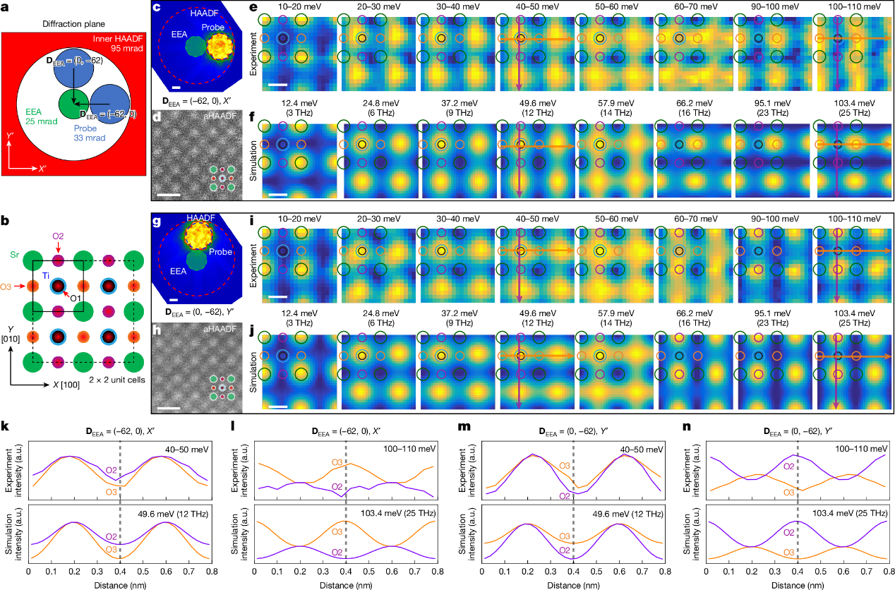 现有声子表征技术存在显著瓶颈:其一,空间分辨率低(微米级),仅能获取宏观尺度的平均振动信息,无法捕捉原子级别的振动差异;其二,能量分辨率不足,难以区分不同频率的声子模式,无法精准定位振动各向异性的临界转变能量;其三,元素与位点特异性差,无法实现单一元素(如氧原子)或同一元素不同晶体学位点(如顶点氧、赤道氧)的振动信号分离,导致无法建立原子振动与材料性能的直接关联。
