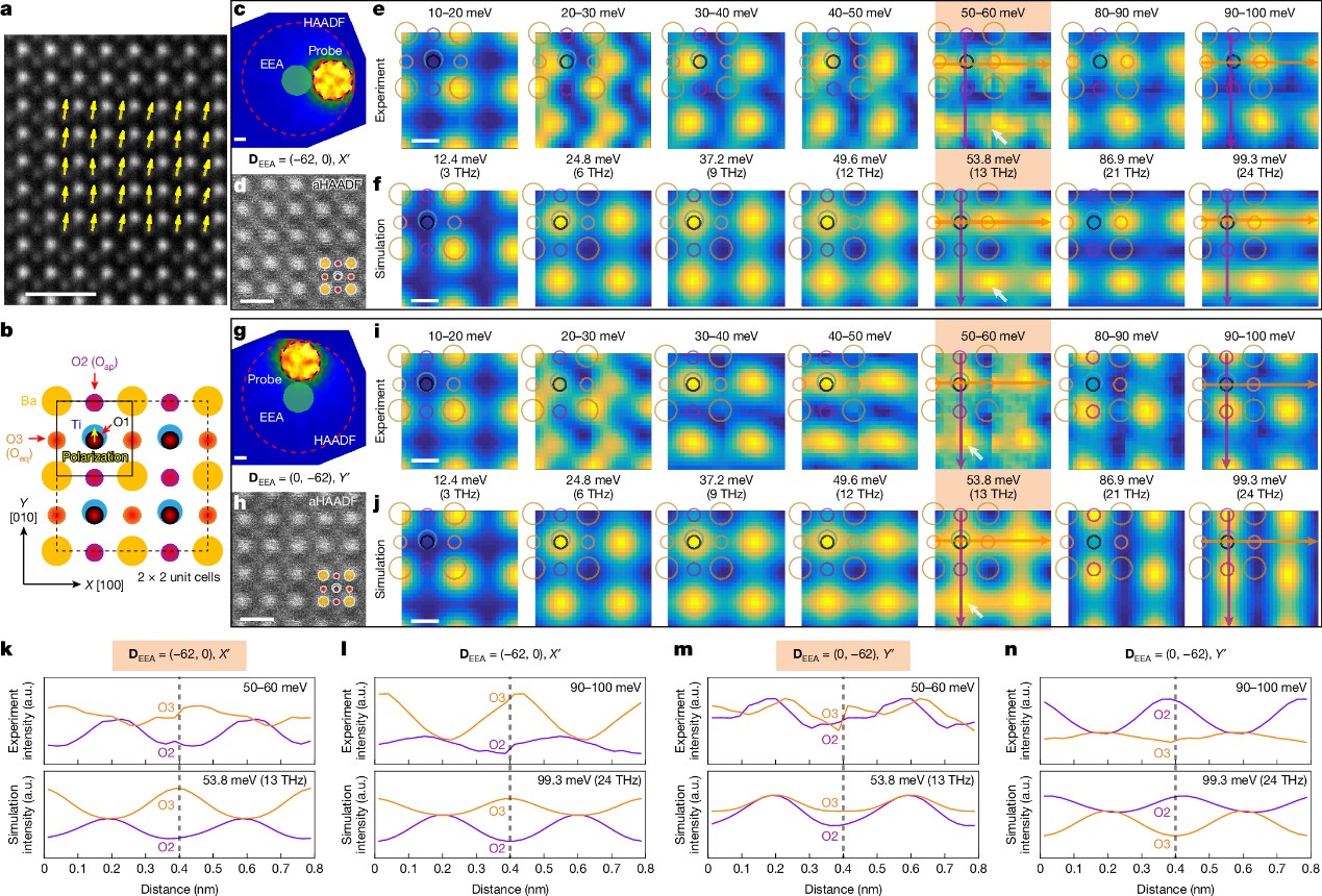 为攻克这一难题,美国加州大学尔湾分校材料科学与工程系潘晓晴教授、物理天文系武汝前教授以及瑞典乌普萨拉大学Ján Rusz课题组合作开发一种兼具原子级空间分辨率、亚10 meV能量分辨率及元素/位点特异性的表征方法——动量选择性电子能量损失谱(q-selective EELS)。通过该技术,精准揭示中心对称材料(如SrTiO3)与非中心对称材料(如BaTiO3)中,特定元素(重点为氧原子)在不同频率下的声子振动各向异性规律,明确振动各向异性随晶体对称性、铁电极化等因素的演变机制,从而建立原子级声子行为与材料宏观介电、铁电等性能的构效关系,为低对称性材料的性能调控及新型功能器件开发提供实验支撑。该成果以“Atomic-scale imaging of frequency-dependent phonon anisotropy”为题发表在国际学术期刊《Nature》。