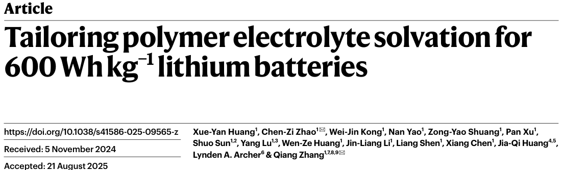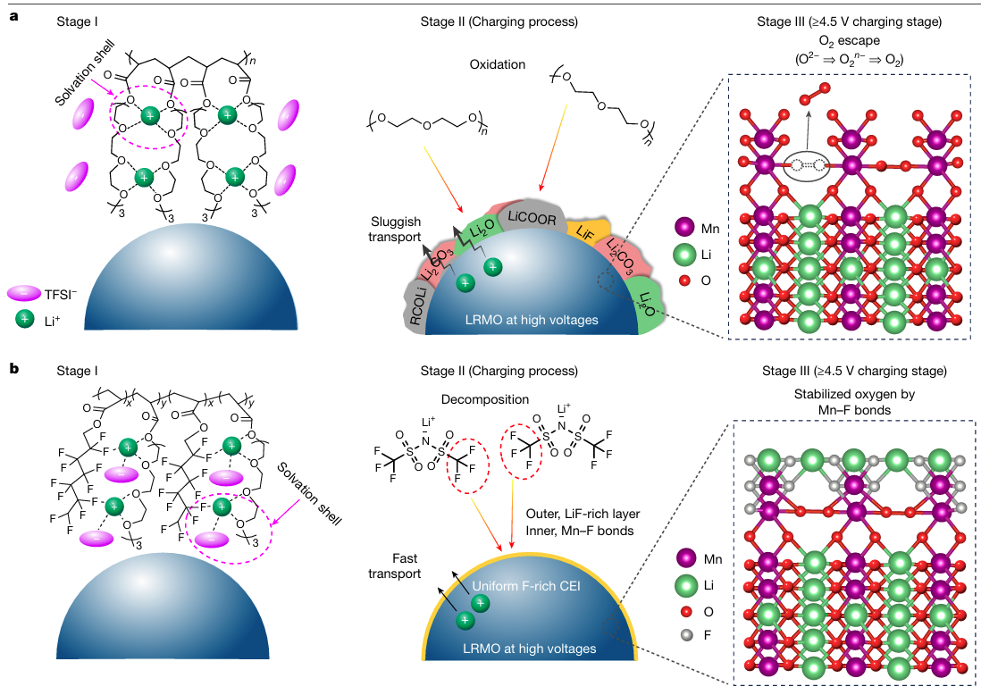 与富锂锰基层状氧化物(LRMO)正极和无阳极电池设计搭配的聚合物电解质被认为极具高能量密度和高安全性。然而,阳极的不稳定形貌变化以及电解质与正极界面处的不可逆阴离子反应会导致氧气逸出和聚合物电解质的催化分解,从而引起严重的界面退化和较差的循环稳定性。在此,清华大学的张强教授团队,设计了一种基于氟聚醚的内置聚合物电解质,它由强溶剂化的聚醚和弱溶剂化的含氟烃基侧链组成,形成了富含阴离子的溶剂化结构,进而在正极和负极上产生了源自阴离子的富含氟的界面层,以抵抗界面问题。LRMO正极展现出了改善的氧气氧化还原可逆性,大幅减少了涉及氧气的界面副反应。这种准固态聚合物电解质含有30%质量分数的三甲基磷酸酯,使得LRMO正极在软包电池中实现了可逆的高面容量循环(>8毫安时/平方厘米)和在扣式电池中超过500次循环的长期稳定性。软包电池展现出604瓦时/千克(1027瓦时/升)的能量密度,并且在满电状态下经受“钉子穿透测试”时表现出卓越的安全性。该工作为制造实用的高能量密度和高安全性锂离子电池提供了一个新的方向。相关研究成果以“Tailoring polymer electrolyte solvation for 600 Wh kg−1 lithium batteries”为题目,发表在国际顶级期刊Nature上。