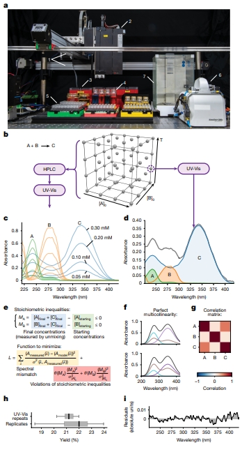 2.以光学检测为核心的高效产率定量方法:论文创新性地主要依赖快速、廉价(每个样品几美分)的紫外-可见(UV-Vis)光谱,而非传统昂贵且耗时的分析技术(如NMR、LC-MS)。通过开发先进的光谱解混算法,即使产物的光谱特征重叠严重,也能从复杂的混合光谱中定量解析出多种产物和副产物的浓度,从而实现对反应结果的低成本、高通量分析。