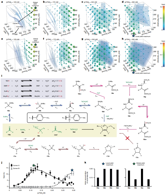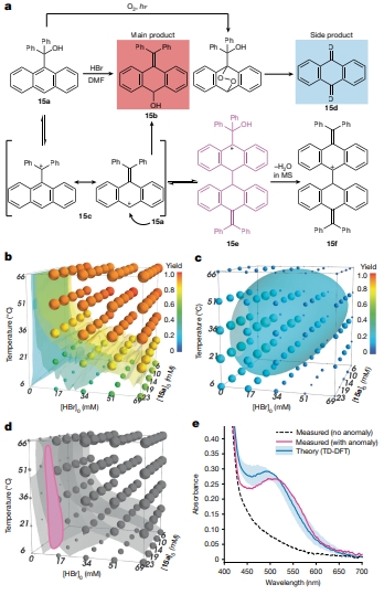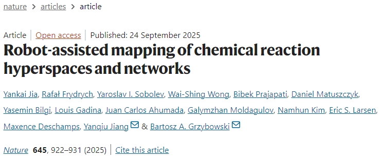 韩国基础科学研究院Bartosz A. Grzybowski、Yanqiu Jiang开发了一种低成本、高通量的机器人平台,结合紫外-可见光谱(UV-Vis)和算法驱动的光谱解混技术,实现了对化学反应在多维条件空间(如浓度、温度、催化剂组成等)中的产率分布和反应网络进行系统映射。该平台避免了传统耗时昂贵的分析手段(如NMR或LC-MS),首次在数千种条件下快速量化产物和副产物产率,并数学证明了产率分布通常具有平滑性(即变化缓慢),同时发现了意外反应区域、产物切换现象以及隐藏的中间体。通过应用于经典反应(如E1、SN1、Ugi型反应、Hantzsch合成等),研究不仅重建了复杂的反应网络,还揭示了新产物和反应路径,甚至在一个多世纪以来已被广泛研究的反应中发现了未知组分,为反应优化、网络控制和多样性合成提供了可扩展的框架。研究成果以Robot-assisted mapping of chemical reaction hyperspaces and networks为题发表于Nature。