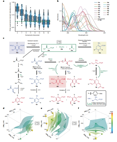 7.“闭环”策略实现近乎完整的反应网络重建:论文提出了一种迭代式的“闭环”工作流程:通过机器人筛选发现未知光谱信号 -> 指导HPLC分离纯化新组分 -> 将新组分的标准光谱加入解混算法 -> 重新拟合整个超空间数据。通过多次循环,成功地将一个研究了近150年的Hantzsch反应的已知产物数量翻倍,近乎完整地重建了其复杂的反应网络。