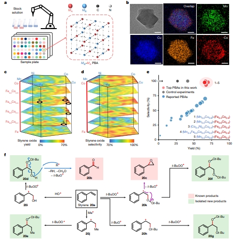 8.将超空间映射拓展至组成空间(催化剂优化):将超空间的概念从反应条件(浓度、温度)拓展至催化剂的本征组成维度。通过机器人自动化合成了756种不同金属组成的普鲁士蓝类似物(PBA)催化剂,并绘制了其催化苯乙烯环氧化反应的产率和选择性五维超空间图,发现了性能优于文献报道的新催化剂组成,展示了该方法在材料发现和优化中的潜力。