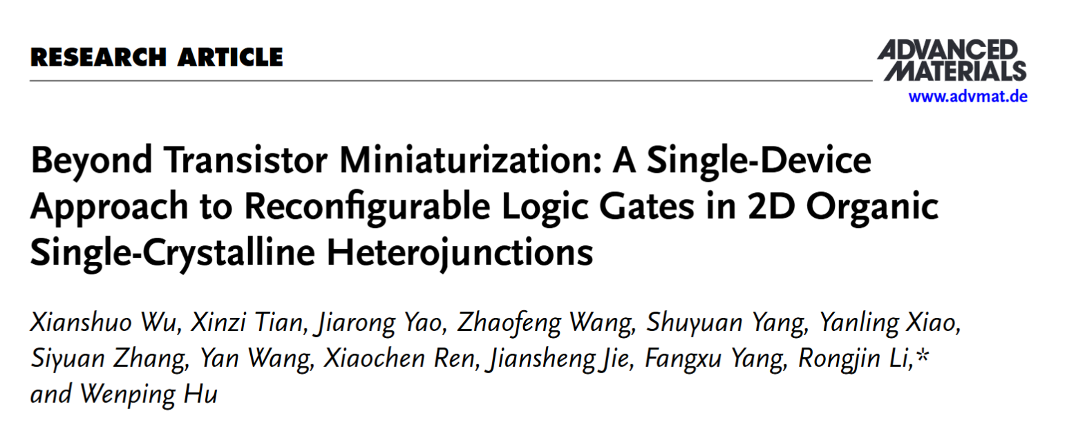 文章以“Beyond Transistor Miniaturization: A Single-Device Approach to Reconfigurable Logic Gates in 2D Organic Single-Crystalline Heterojunctions” 为题发表于 Advanced Materials上。通讯作者为天津大学李荣金教授,第一作者为天津大学研究生武显硕、田馨孜。