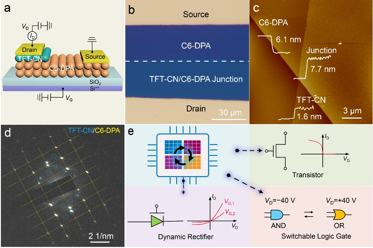 成功的关键是构造了可重构不对称异质结(RAH)。具体而言,RAH器件包含双分子层的C6-DPA单晶层跨越源极和漏极,而单分子层的TFT-CN单晶仅位于漏极侧。RAH能够在外加偏置极性的调节下切换两种完全不同的载流子注入机制。在正偏置时,器件采用F-N隧穿机制;而在负偏置时,则采用热发射机制。这一结构使得器件能够在“导通/截止”与“强整流/弱整流”之间自由切换,成功实现了晶体管、动态整流器及可切换逻辑门“三合一”的功能设计。