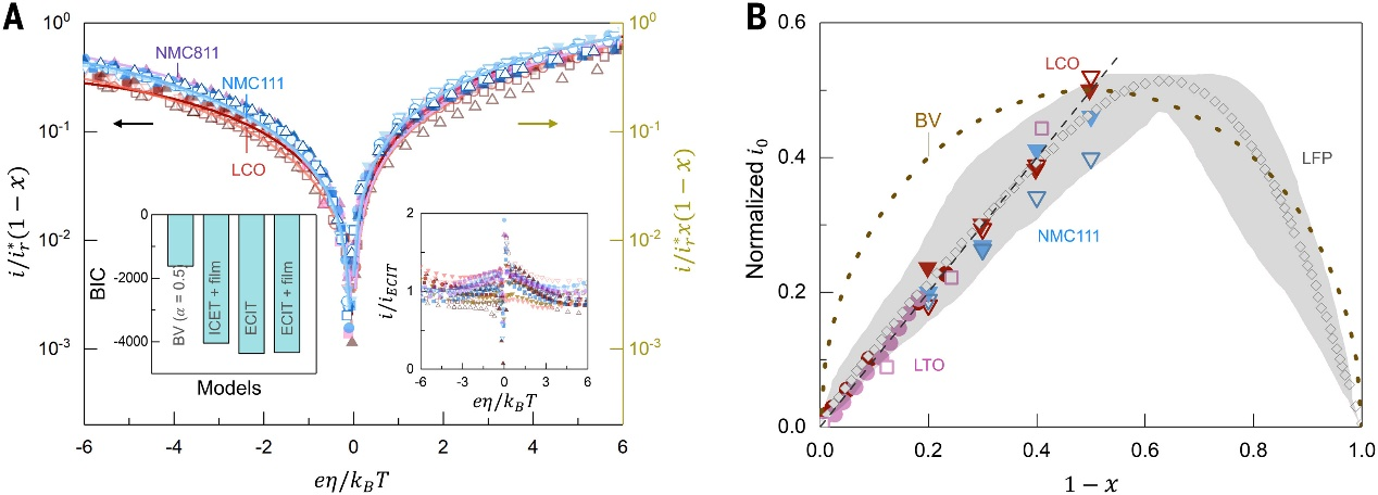 为攻克这一难题,美国麻省理工Yang Shao-Horn和Martin Z. Bazant教授等人提出并验证锂离子电池中锂离子嵌入的耦合离子-电子转移(CIET)机制,整合经典离子转移模型与Marcus电子转移理论,解决传统Butler-Volmer(BV)方程微观细节缺失、交换电流密度预测偏差大的问题,还预测出反应速率与锂空位分数的强相关性及量子力学反应极限电流。并且通过电荷调整恒电位脉冲法,在多种电极材料、电解液和温度下测得电流密度随锂空位分数及过电位线性增加,8种电极材料倍率性能呈容量随电流线性衰减,数据可依CIET坍缩到通用曲线。同时证实CIET拟合优度优于BV方程,明确锂电池受CIET反应限制(非扩散限制),为快充高功率锂电池设计提供新依据。