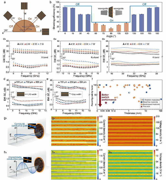 图1.电磁干扰(EMI)屏蔽调控的性能与机制:(a)超表面旋转过程示意图;(b)X波段下不同旋转角度的电磁干扰屏蔽效能;(c)X波段、Ku波段及K波段的电磁干扰屏蔽效能测试(EMI SET)结果;(d、e)不同激光诱导石墨烯(LIG)宽度和间隙宽度下X波段的电磁干扰屏蔽效能测试(EMI SET)结果;(f)本研究与已报道研究的可重构因子(r)对比;(g、h)电磁干扰屏蔽调控性能示意图,及通过CST软件模拟得到的电流密度与电压密度分布