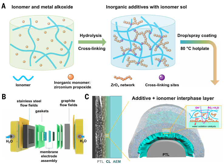 阴离子交换膜水电解器(AEMWEs)作为一种具有潜力的绿色制氢技术,因其低成本和可扩展性而备受关注。然而,其阳极离子聚合物的电化学稳定性不足,严重制约了其实际应用。本研究通过界面工程策略,引入含无机物的分子添加剂,与阳离子聚合物共组装形成稳定的界面结构。实验结果表明,采用该策略的纯水进料AEMWEs在2.0安培每平方厘米电流密度和70℃条件下,降解速率低于0.5毫伏每小时,相较于传统AEMWEs,耐久性提高了20倍以上。其稳定化机制来源于金属氧代/氢氧化物低聚物与离子聚合物之间形成交联结构,以及在电解过程中,无机添加剂在阳极区域富集,形成一层界面层能够有效钝化阳极离子聚合物,防止其持续降解,同时保持了离子聚合物的机械完整性和氢氧根离子导电性。在此,美国加利福尼亚大学伯克利分校的Shannon W. Boettcher团队,提出的基于添加剂的界面工程策略,为开发无需支撑电解质的高性能、高耐久性AEMWEs提供了一种可行的技术路径,相关研究成果以“Durable, pure water-fed, anion-exchange membrane electrolyzers through interphase engineering”为题目,发表在国际顶级期刊Science上。该策略具有良好的普适性,可适用于多种催化剂和离子聚合物体系,有望推动电化学技术在更广泛领域的应用。