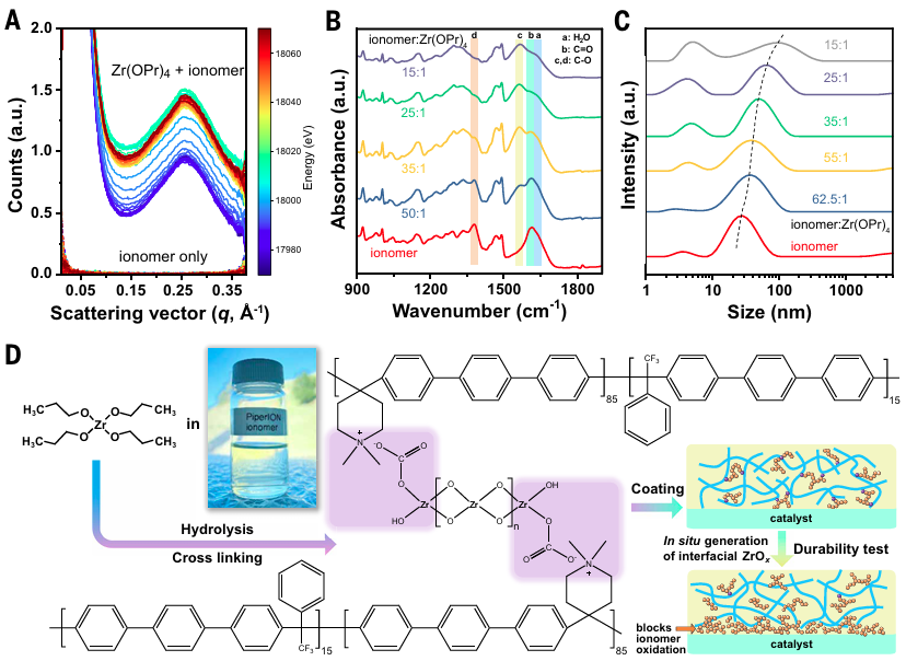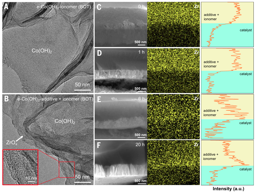 本文通过引入并应用了界面工程策略于基于聚合物的电化学装置中,使得以纯水为原料的AEMWEs的耐久性提高了超过一个数量级。通过简单且可扩展的溶胶-凝胶化学方法形成的无机添加剂物种与聚合物之间的分子相互作用,是构建坚固且具有离子导电性的材料和界面的核心。在运行过程中,具有氧化惰性的ZrOₓ无机组分在催化剂界面处富集,防止聚合物的持续电化学氧化降解,同时增强并保持机械稳定性。将这些进展与更活跃的电催化剂相结合,例如在阳极使用高负载的金属钙钛矿氧化物和在阴极使用优化的PtRu催化剂,以及钝化层和聚合物化学的迭代改进,可能使纯水AEMWE成为一种具有颠覆性的商业电解制氢技术。更广泛地,这些方法可用于创建界面层,通过限制作用控制催化剂的溶解和再沉积,防止在基于烃类聚合物的装置(如质子交换膜燃料电池)中发生氧化副反应,并调节界面粘附性和催化剂层的机械性能。