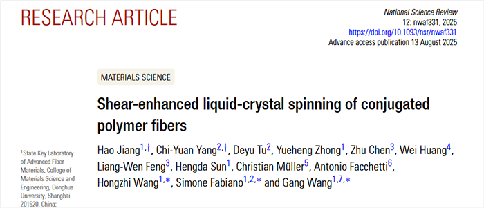 为解决这一问题,东华王刚研究员、王宏志教授联合林雪平大学Simone Fabiano教授提出了剪切增强液晶纺丝新策略,实现了高机械性能和高半导体性能的结构功能一体化半导体纤维的制备。相关研究以“Shear-enhanced liquid crystal spinning of conjugated polymer fibers”为题发表在学术期刊National Science Review上(DOI: 10.1093/nsr/nwaf331)。博士生蒋浩与林雪平大学杨驰远助理教授为共同第一作者。相关工作得到了朱美芳院士指导,受到国家自然科学基金、国家重点研发项目等支持。