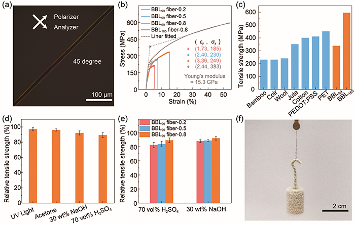 分子量与取向-结晶度的协同提升带来了“高强度—高韧性—高耐受”的综合性能。高分子量 BBL165 可实现杨氏模量约 15.3 GPa、抗拉强度约 600 MPa、断裂伸长率约 54%,屈服强度约 383 MPa,满足并优于织造级应用门槛;环境稳定性方面,纤维在 −120 – 250 °C 恒载热机械测试下形变变化极小,DSC 0 – 300 °C 无明显相变,TGA 至 500 °C 仍保留约 98.2% 质量;在强 UV(365 nm,5000 W·m⁻²,12 h)与强酸/强碱/有机溶剂中,BBL 纤维分别保持约 96% 与 90 – 94% 的强度,显著优于低剪切取向样品,凸显结构有序性对抗环境扰动的决定性作用。