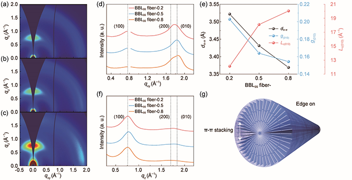 GIWAXS/WAXS 证实纤维呈现沿轴向高度有序的 edge-on 取向特征:lamellar (100) 峰位于 q ≈ 0.76 Å⁻¹(d ≈ 8.27 Å),π–π 堆积 (010) 峰位于 q ≈ 1.87 Å⁻¹(d ≈ 3.37 Å),随剪切增强 dπ–π 由 3.52 Å 降至 3.37 Å,(010) 峰半高宽收窄、相干长度 Lc(010) 增加、无序度 g(010) 降低;WAXS 计算的 Hermans 取向因子约 0.72,说明分子主链面与纤维轴平行而 π–π 堆叠沿径向排列;SAXS 在赤道方向出现 qed = 0.144 Å⁻¹ 的弧形散射,对应约 43.8 Å 的双相周期性,且其取向与纤维轴一致,表明由剪切诱导的各向异性液晶结构在凝固后被有效“锁定”,形成贯通的各向异性传输骨架。