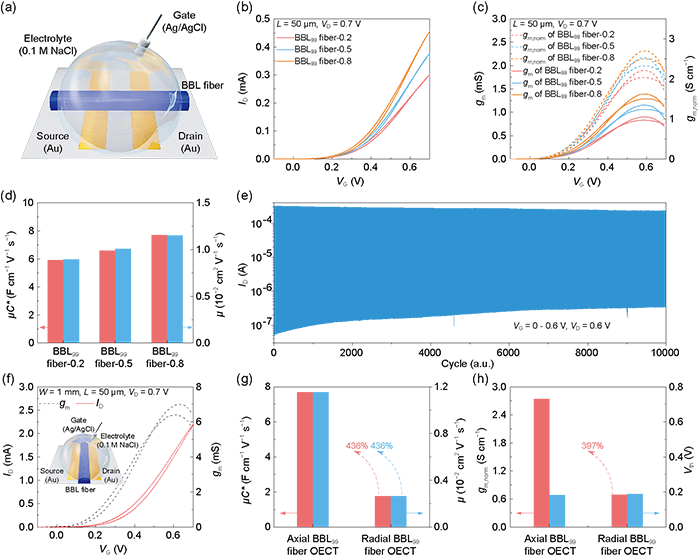 随着剪切强度的增加,纤维取向度与结晶度的增强显著提升器件表现:在基于 BBL 纤维的 n 型累积式 OECT 中,ID提升约 53%、ION/IOFF 提升约 160%、几何归一化跨导 gm,norm 提升约 25%;本征参数方面,μC* 提升约 30%,在 C* 近似不变的前提下,载流子迁移率提升约 28%。方向各向异性上,轴向相较径向关键指标约提升 400%;同时在门脉冲下经 >10000 次循环仍维持约 103的开关比与稳定输出。