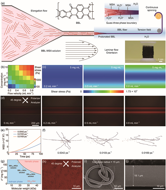 图1 液晶纺丝连续化制备半导体纤维:工艺示意与宏观纤维、不同流速下的剪切速率/应力模拟、剪切力驱动向列流动的 POM 观察、不同剪切条件下的 MSD 与分子轨迹、临界浓度—分子量相图(Flory 刚棒模型拟合相界)、以及纤维SEM图像