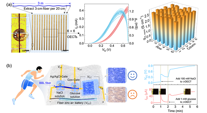 在系统集成方面,团队构建了全织物 OECT 阵列,显示出优良的一致性;进一步利用纤维 OECT 实现多输入 NAND 逻辑门,并与电致变色织物和纤维锌空气电池集成,搭建可视化逻辑感知系统:对汗液中的 Na⁺/K⁺ 与葡萄糖进行“与非”判决后,可通过颜色变化直观反馈健康状态。