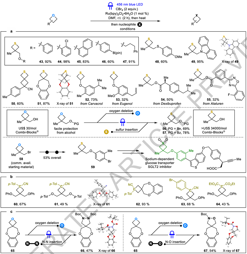 四元环状结构如氮杂环丁烷、硫杂环丁烷和环丁烷在药物化学中具有重要地位,因其在生物活性分子中常具备优异的理化性质,如高稳定性、代谢稳定性和靶向特异性。然而,传统合成这些环系的方法通常依赖于多步环加成或亲核取代反应,步骤繁琐、效率低且产生大量废弃物。因此,开发一种能够直接、高效地将易得的氧杂环丁烷中的氧原子替换为氮、硫或碳原子的方法,具有重要的合成价值与应用前景,尤其适用于药物分子的后期功能化与结构多样性拓展。