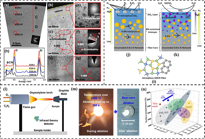图11 (a)水蒸气环境下处理的SiBCN纤维TEM图像;(b–d)分别对应(a)中标记B、C、D区域的HRTEM图像;(e–g)分别为(b–d)中红色矩形区域的HRTEM放大图;(h)分别对应(a)中标记为EDS-I、II、III、IV区域的EDS图(I)、(II)、(III)和(IV);(i)SiBCN纤维微观结构示意图;(j)和(k)分别示意SiBCN纤维在空气(j)和水蒸气(k)环境下的腐蚀机制;(l)乙炔氧焰烧蚀实验示意图;(m)烧蚀实验中样品的光学图像;(n)所制HfB2/SiC复合材料的密度/表面温度/线烧蚀率与已报道超高温陶瓷及高熔融复合材料数据的对比。