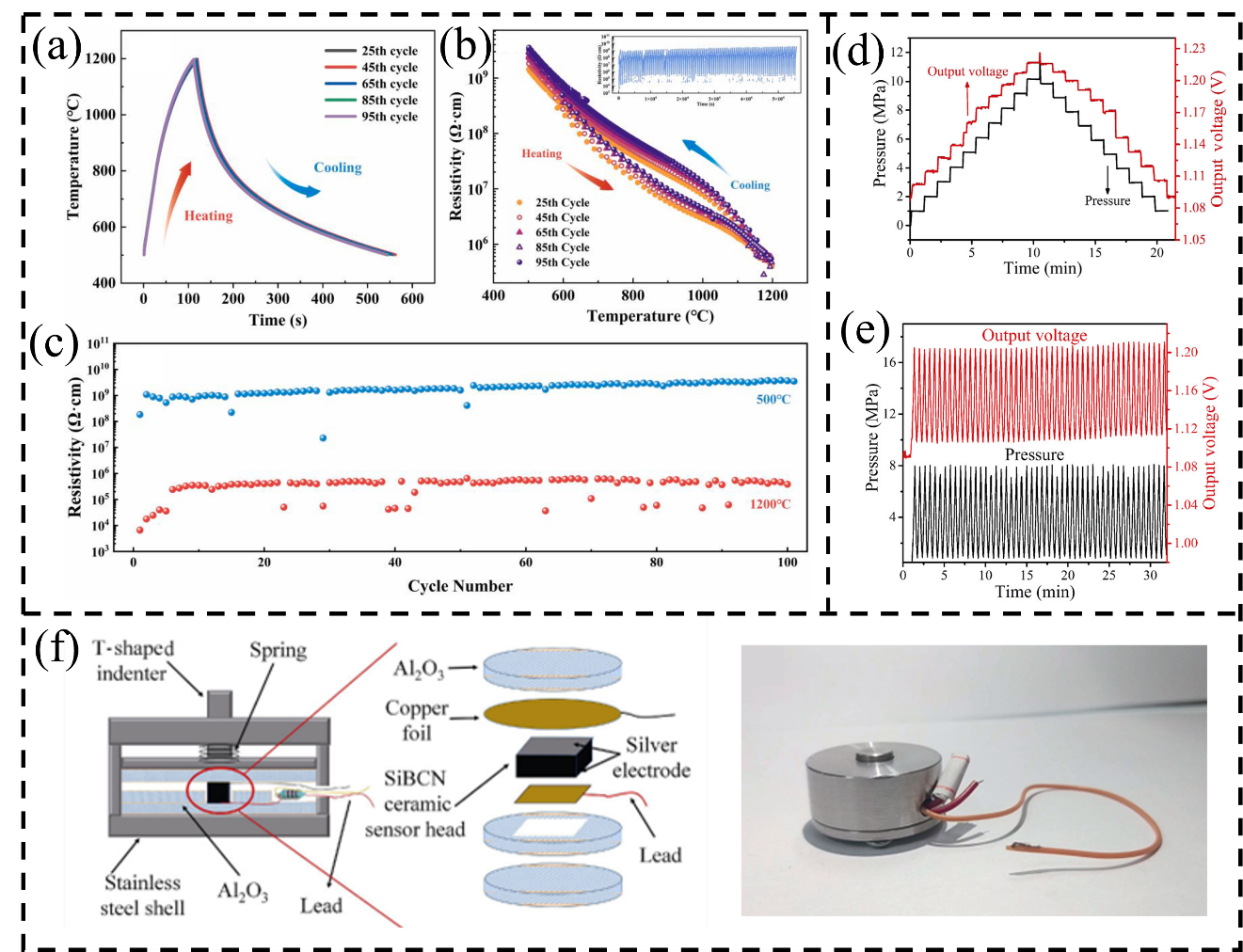 图15 (a)测试系统的加热与冷却速率;(b)SiBCN陶瓷在不同加热/冷却循环下的电阻率-温度曲线;(c)SiBCN陶瓷在空气中100次热-冷循环电阻率变化;(d)SiBCN压力传感器的加载-卸载循环;(e)SiBCN压力传感器50次加载-卸载循环的可重复性评估;(f)聚合物先驱体转化SiBCN陶瓷压力传感器的结构设计与组装示意图。