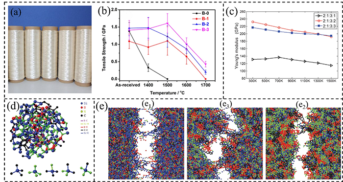 图7 (a)SiBN纤维;(b)不同硼含量陶瓷纤维的抗拉强度与退火温度的关系;(c)SiBCN陶瓷的杨氏模量随温度变化关系;(d)SiBCN陶瓷的原子构型;(e)陶瓷断裂结构示意图。