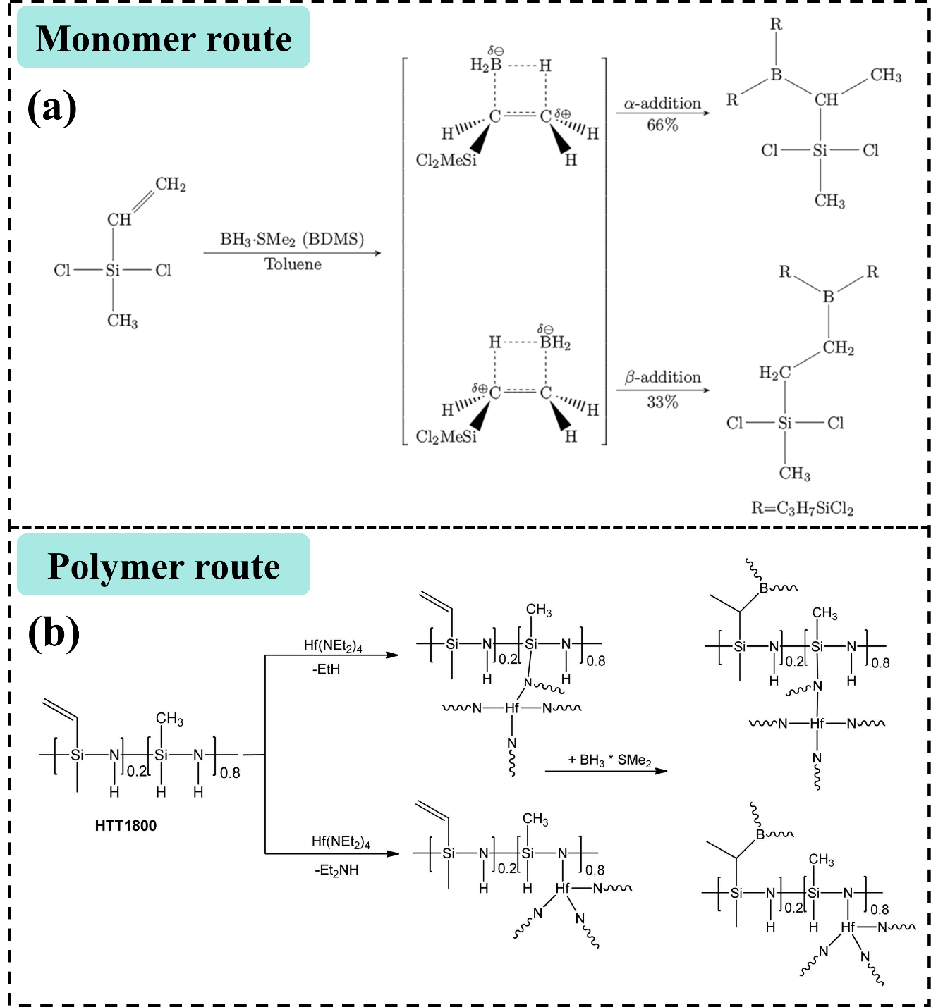图4 (a)DCMVS与BDMS分子合成路线和(b)Durazane 1800聚合物与BDMS及四(二乙氨基)铪聚合物合成路线。