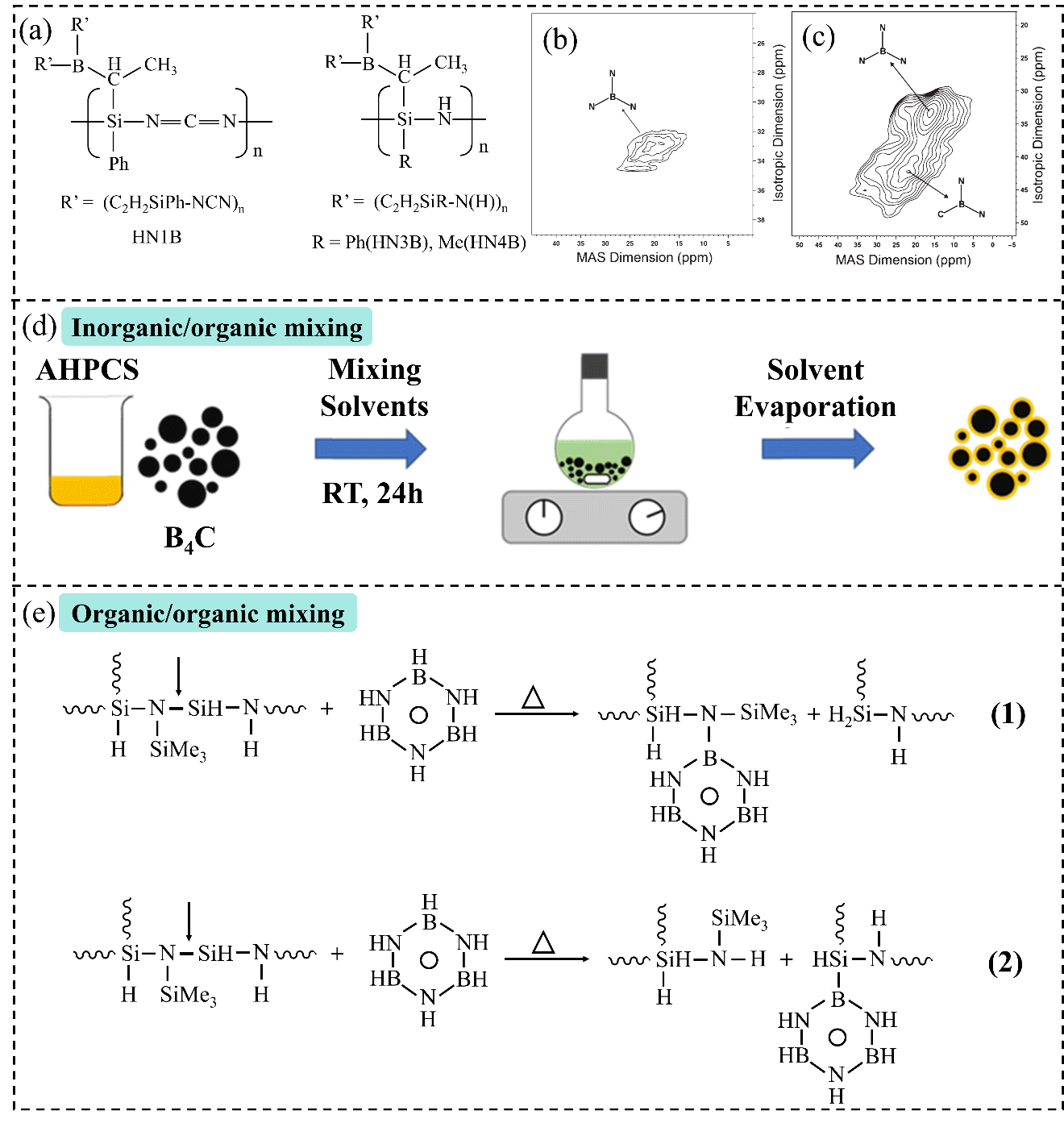 图3 (a)HN1B、HN3B和HN4B先驱体的分子结构;(b)HN1B和(c)HN4B的11B 魔角旋转核磁共振谱图;(d)AHPCS对B4C颗粒进行表面的官能化;(e)硼嗪改性氢聚硅氮烷的反应路径。
