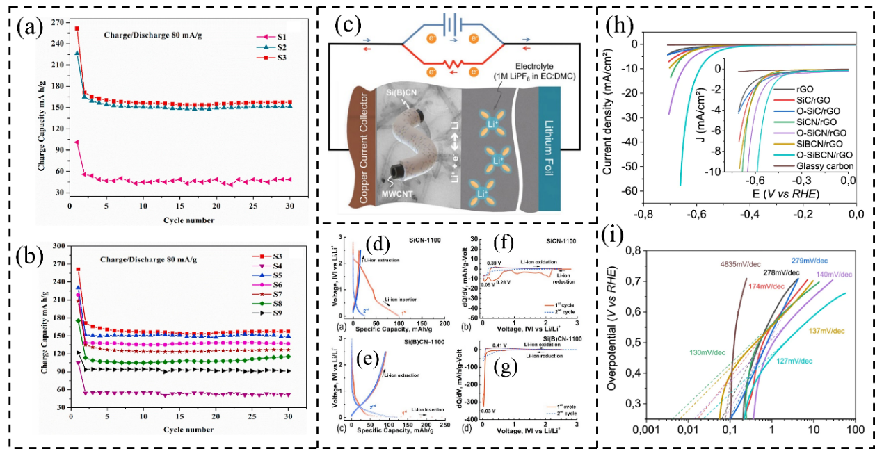 图13 (a)和(b)SiBCN陶瓷负极在30个循环中的放电容量变化;(c)SiBCN基锂离子电池半电池结构示意图;(d, e)SiCN及(f, g)Si(B)CN样品的电化学嵌锂/脱锂的首循环与第二循环及对应的dQ/dV曲线;(h)不同催化剂的极化曲线;(i)不同催化剂的Tafel斜率。