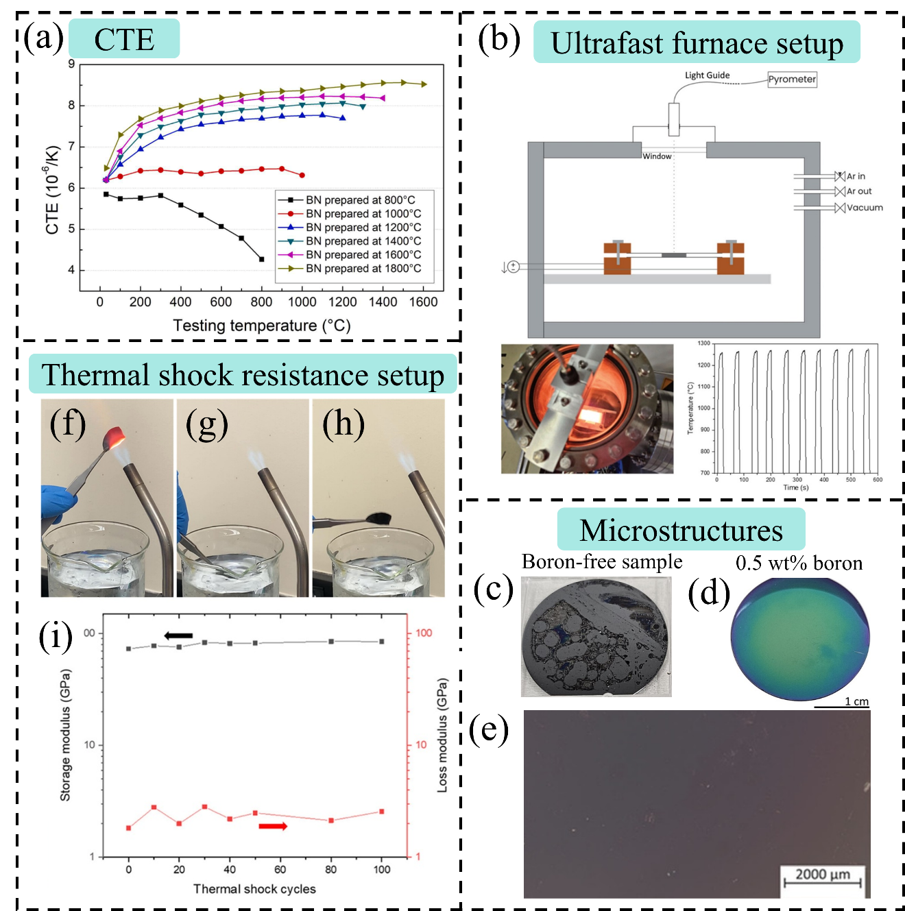 图9 (a)BN陶瓷的线膨胀系数;(b)超快升温炉装置示意图;(c)SiCN涂层;(d)SiBCN涂层;(e)Si(HfTa)BCN涂层10次热震后SEM图像;(f-h)SiC/BN复合材料热震抗性的实验装置(i)100次热震循环后的储能模量与损耗。