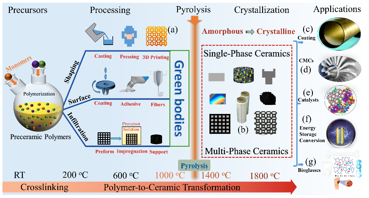 图2 聚合物合成、加工、聚合物向陶瓷的转化、结构特征及制备陶瓷的应用示意图。