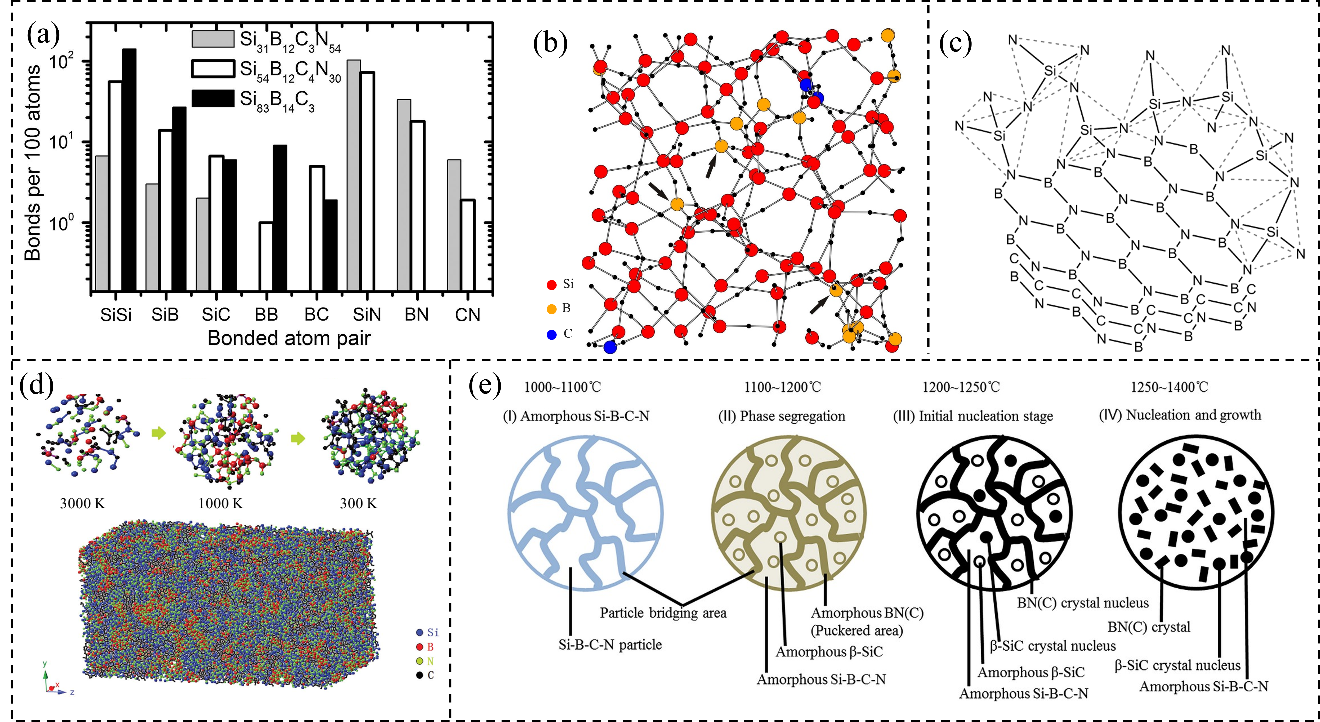 图6 (a)不同氮/硼组成SiBCN陶瓷的键合统计分布;(b)SiBC陶瓷分子结构示意图;(c)和(d)SiBCN陶瓷非晶结构;(e)SiBCN陶瓷结晶演化示意图。