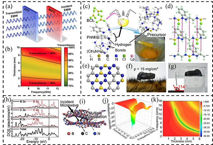 图14 (a)SiBCN陶瓷透波机制示意图;(b)SiBCN陶瓷透波性能;(c)BCN聚合物先驱体的合成流程;(d, e)合成BCN的化学结构特征;(f)轻质BCN块体陶瓷光学照片;(g)BCN块体材料的接触角;(h)BCN陶瓷DOS;(i)BCN陶瓷电磁波耗散机制示意图;(j)和(k)BCN陶瓷吸波图。