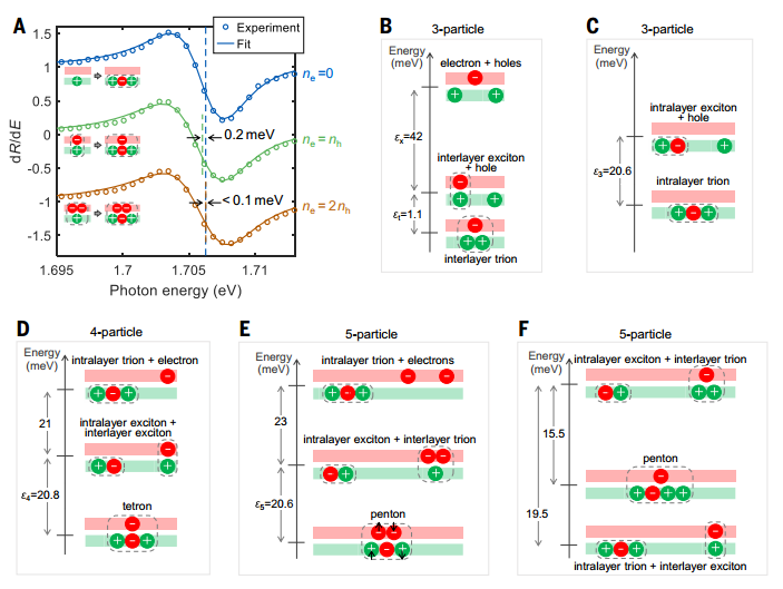 多粒子电子-空穴(e-h)态通常由瞬态光学激发,但由于寿命较短,稳态量子相难以实现。由两层过渡金属二硫化物(TMD)半导体层通过薄层六方氮化硼(hBN)隔开的范德华异质结构,能够构建可控的电子-空穴双层结构。这种构型为探索热平衡状态下的多粒子电子-空穴复合体系提供了新途径。此前,在MoSe2/hBN/WSe₂异质结构中已实现电控层间激子(即相关电子-空穴束缚对),由此观测到层间激子绝缘体(EIs)及完美的库仑拖曳效应。此类激子流体有望形成高温激子凝聚态。理论预测在强耦合极限下,电子-空穴双层结构中存在三粒子与四粒子电子-空穴复合态,可能引发不同类型的量子行为。但遗憾的是,其实验实现始终难以实现。
