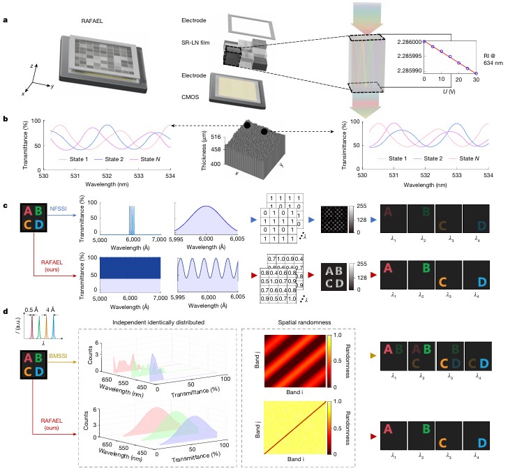 近日,来自清华大学的方璐教授课题组在国际知名期刊Nature发表题为《ntegrated lithium niobate photonics for sub-angstrom snapshot spectroscopy》的研究论文,提出了一个具有革命性性能的RA照RAFAEL系统,更通过其精巧的物理设计(可重构铌酸锂)和智能的计算重建算法(PSAIR),实现了前所未有的综合性能指标,显著超越了现有技术,总透过率高达 73.2%,亚埃级光谱分辨率可达到约 0.5 Å,单次曝光能以 88 Hz 的帧率同时获取超过1200万空间像素,从根本上解决了光谱学领域长期存在的“分辨率-透过率-效率”三者难以兼顾的难题,为未来的高光谱成像技术开辟了全新的道路。