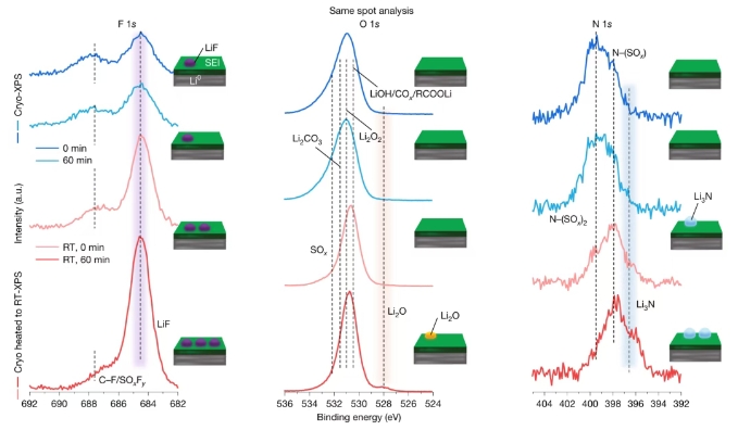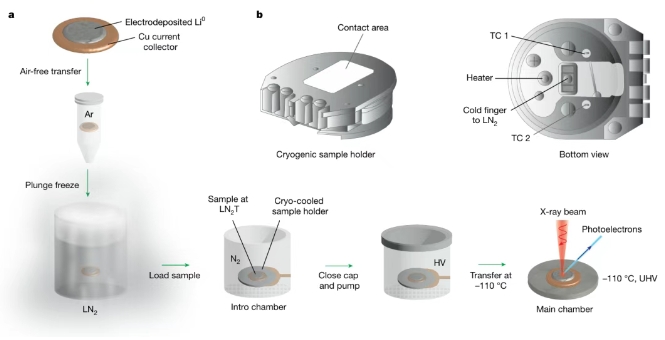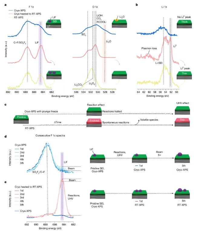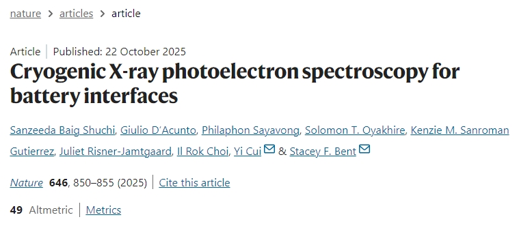 斯坦福大学崔屹、Stacey F. Bent等人创建了 “cryo-XPS”技术,如同给敏感的电池界面拍了一张 “冷冻电镜”级别的“快照” ,首次揭示了SEI更厚、更复杂的真实原始结构,并据此建立了可靠的成分-性能关系,彻底改变了研究此类敏感界面的范式。研究成果以Cryogenic X-ray photoelectron spectroscopy for battery interfaces为题发表于Nature。