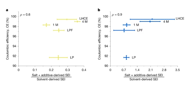 图4:SEI含量与不同电解质化学中库仑效率之间相关性。
