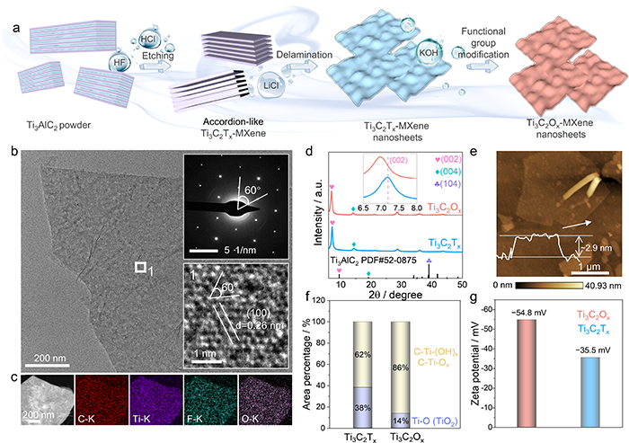 (a) 通过选择性刻蚀和表面端基调控从Ti₃AlC₂合成Ti₃C₂Oₓ的示意图。