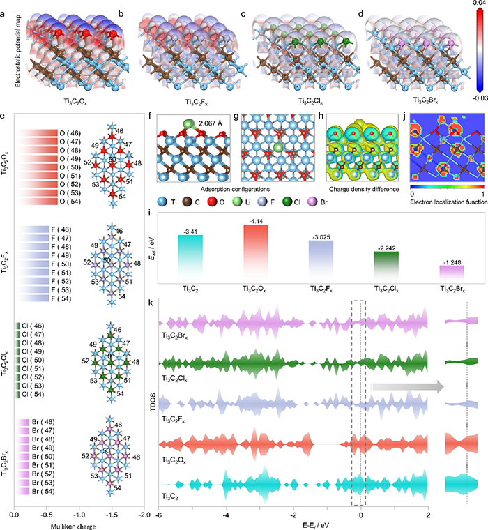 (e) Ti₃C₂Oₓ、Ti₃C₂Fₓ、Ti₃C₂Clₓ和Ti₃C₂Brₓ的Mulliken电荷分布。