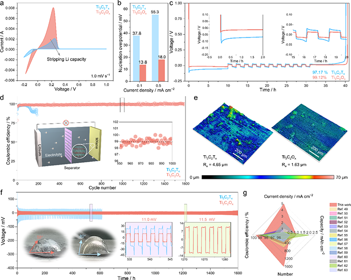 - 电负性驱动稳定界面:形成了以氧化锂主导的SEI, MXene||Cu半电池实现了1600次长循环,库伦效率达99.41%。Ti₃C₂Oₓ@Li对称电池表现出超过 1600 小时的出色长期稳定性。
