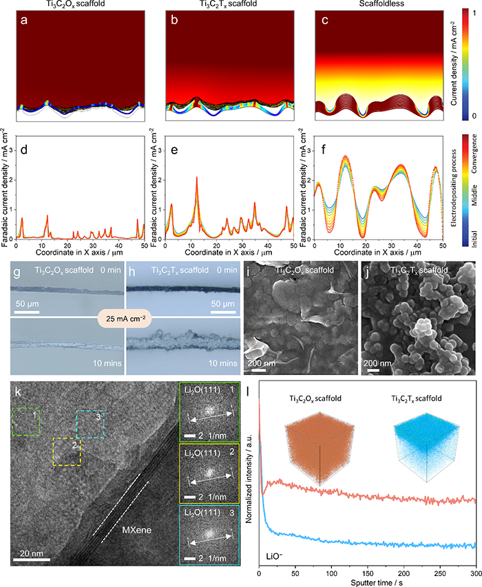 (a, d) Ti₃C₂Oₓ、(b, e) Ti₃C₂Tₓ和(c, f) 无支架体系的锂沉积电流密度分布有限元模拟。