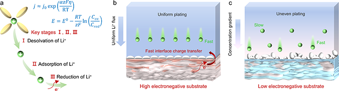 值得关注的是,电负性——表征原子吸引电子能力的基本物理量——尚未被系统开发为锂金属电池界面工程的定向设计参数。理论上,提升表面端基的电负性可增强阳离子吸附、排斥阴离子,从而加速Li⁺去溶剂化过程,均匀化界面离子通量并促进稳定成核。