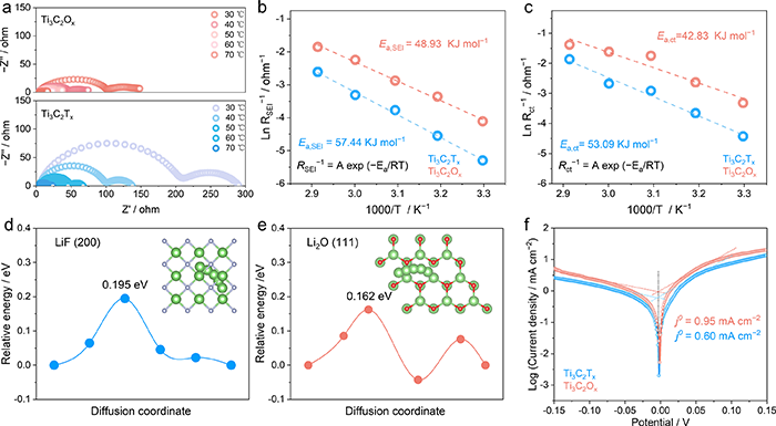 (a) Ti₃C₂Oₓ@Li 和 Ti₃C₂Tₓ@Li 对称电池的温度依赖性电化学阻抗谱(EIS)。