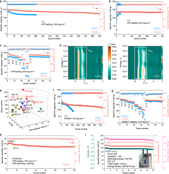 (h, i) Ti₃C₂Oₓ@Li||LFP软包电池在0.1 C和0.2 C下的循环性能。