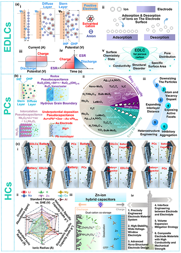 为应对全球气候变化、推动可持续发展,各国正积极制定“碳中和”目标,驱动能源体系向可再生能源主导转型。然而,风电、光伏等新能源发电的间歇性、波动性对电网稳定与能源高效利用构成严峻挑战,使得储能技术成为实现可再生能源大规模应用的关键支撑。在众多储能技术中,超级电容器以其卓越的功率密度、快速充放电能力和超长循环寿命脱颖而出,成为提升可再生能源存储与利用效率的重要解决方案。尽管其能量密度目前仍低于锂离子、钠离子和锌离子等电池体系,但超级电容器在功率输出、响应速度及循环稳定性方面具有显著优势,尤其适用于高功率、瞬时响应的应用场景。随着“电容-电池混合”技术趋势的发展,各类储能设备性能界限逐渐模糊,超级电容器在跨场景应用中的潜力日益凸显。近年来,相关研究与市场快速发展,但其能量密度提升、自放电控制及内部衰减机制等问题仍是当前瓶颈。为此,深入理解超级电容器电极-电解质界面的动态演化机制尤为重要。