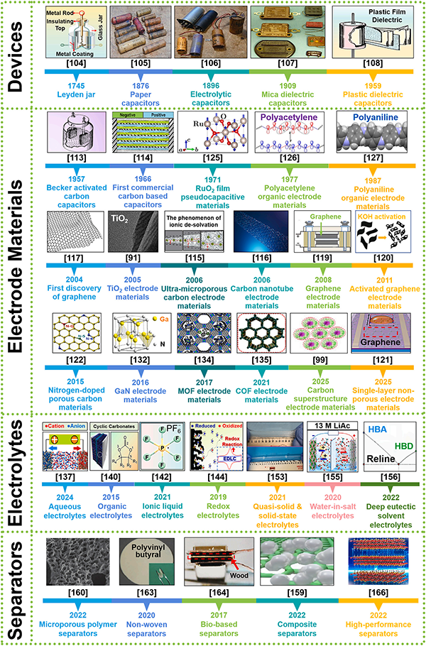 图2 超级电容器器件及核心成分(电极、电解质和隔膜)的历史发展重要节点。