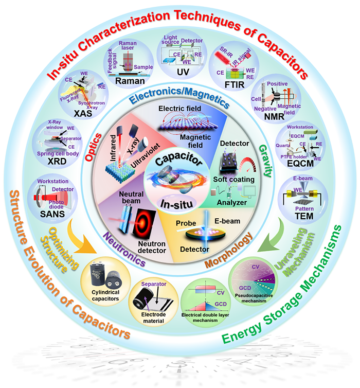 本综述系统梳理了超级电容器的储能机制与核心组件,并重点阐述了如何通过六大类原位表征技术(包括X射线、光学、电磁、重力、形态及中子技术)革命性地深化我们对动态过程的理解。这些技术如同精密的“观察窗口”,能够分别从结构、化学、物理等维度,实时捕捉从离子吸附、界面演化到相变反应的复杂行为,从而在微观和纳米尺度上揭示了电荷补偿、离子输运、反应机制等关键过程。通过对这些先进原位方法的集成性综述,本工作为突破超级电容器的性能瓶颈提供了全面的机理洞察与坚实的方法学支撑,填补了现有综述在系统性和前沿性上的空白。