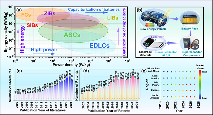 图1 超级电容器的性能、结构、出版情况和市场发展。