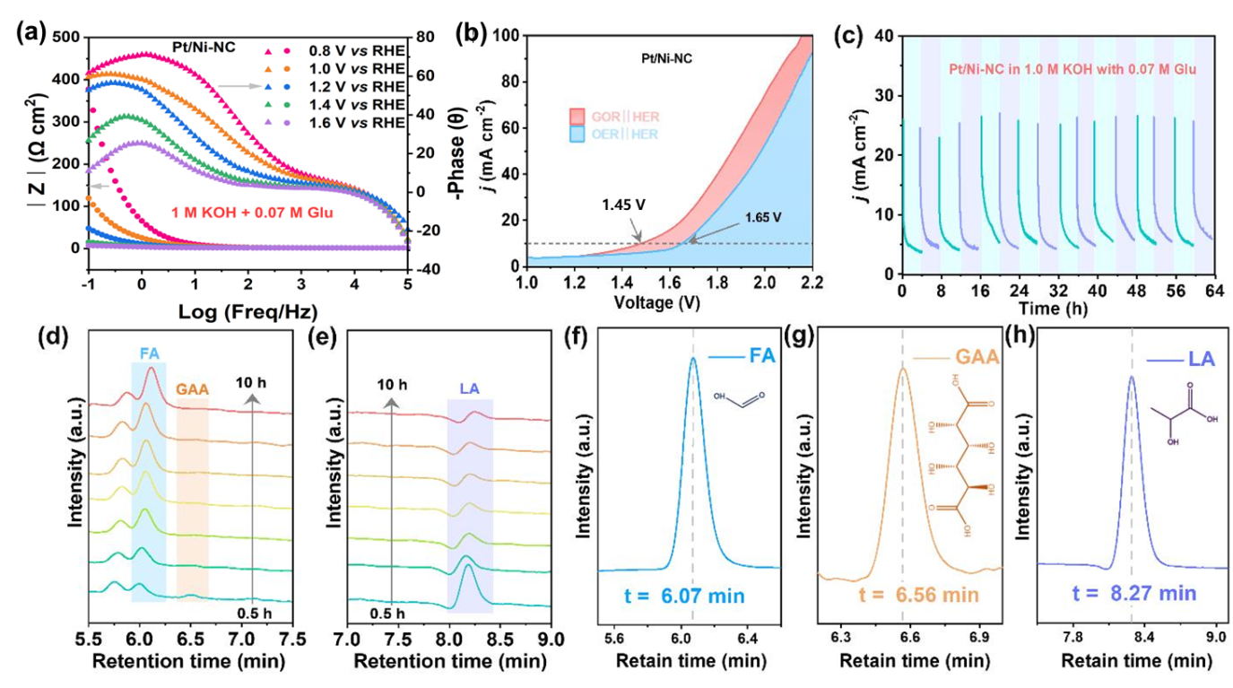 作者通过精确调控Pt与Ni的组分及碳载体结构,制备出高分散的Pt-Ni纳米催化剂。该催化剂在葡萄糖电氧化过程中表现出优异的催化活性和稳定性,同时在阴极侧有效促进氢气析出,实现了电能驱动下的生物质高值化与能源共生产。这一策略打破了传统电解水仅产氢的单一模式,将“废弃生物质”转化为“绿色能源+高附加值化学品”的新途径,为未来可持续能源体系提供了新范式。
